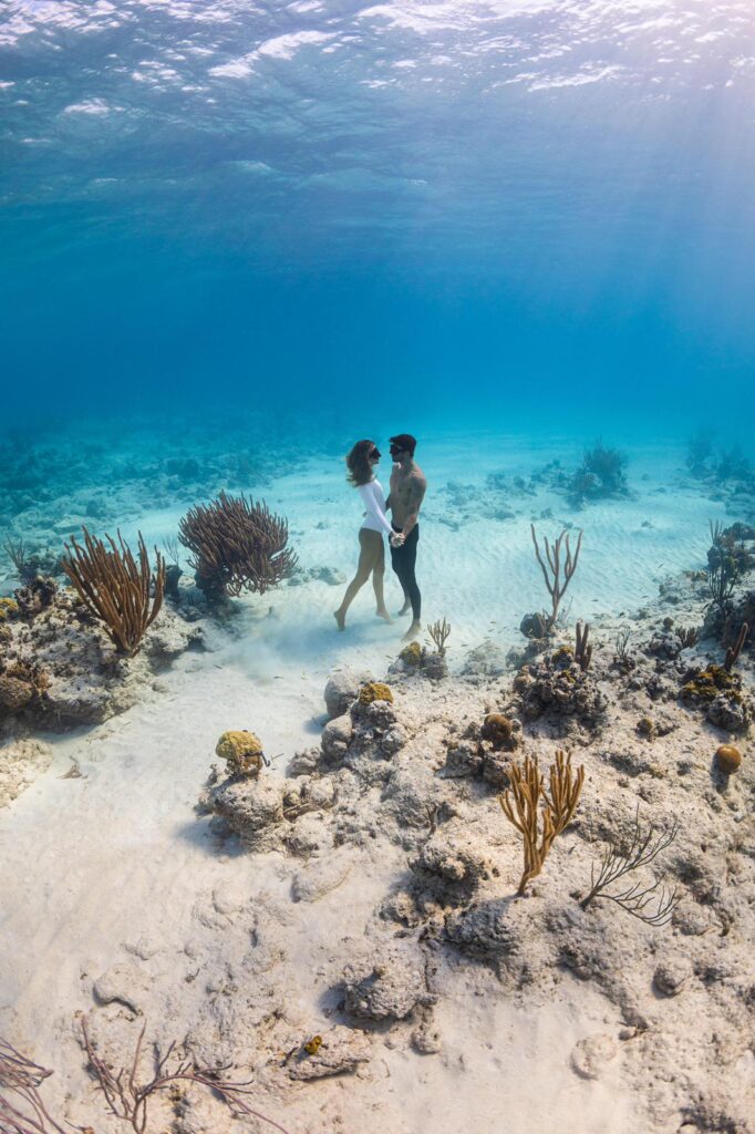 The first stop Andre chose for us was a 70-foot reef right before a drop-off. We were to swim down with only half of our wetsuits and no fins. David and I had only been back in the Bahamas for a few weeks and barely had time to do any deep diving in the past few months and additionally, the water was cold (we get too accustomed to our warm summer water). After multiple attempts of this shot, David was freezing and I was getting a little exhausted.