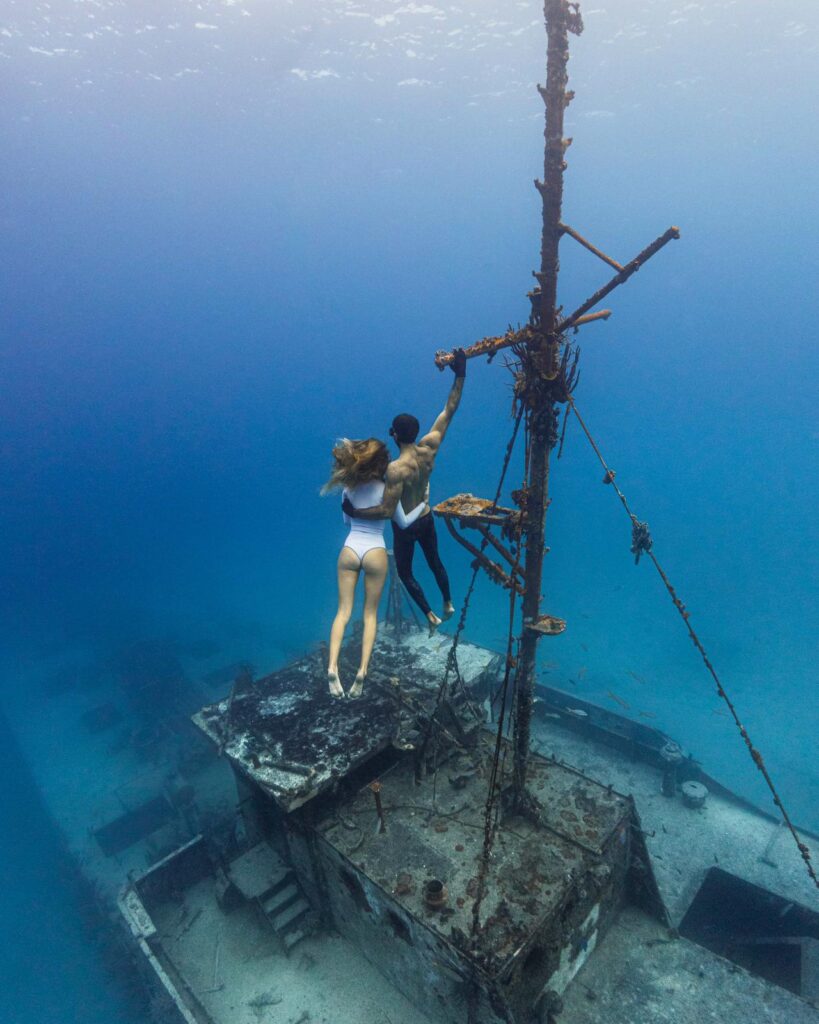 We moved locations to a shallower spot for the next shot. It was a beautiful wreck; we dove down with no fins and half our wetsuits again, but only to about 40 feet. It’s extremely rare to get the perfect shot on the first dive, but we got it within a few dives and moved onto the next spot.