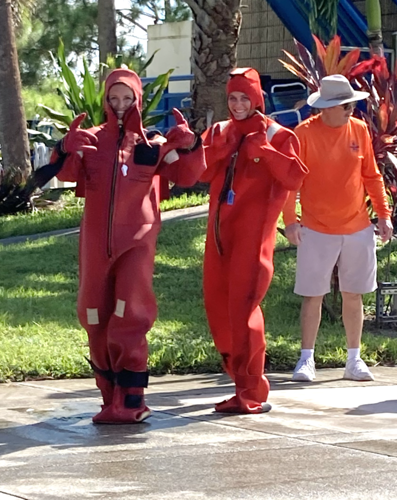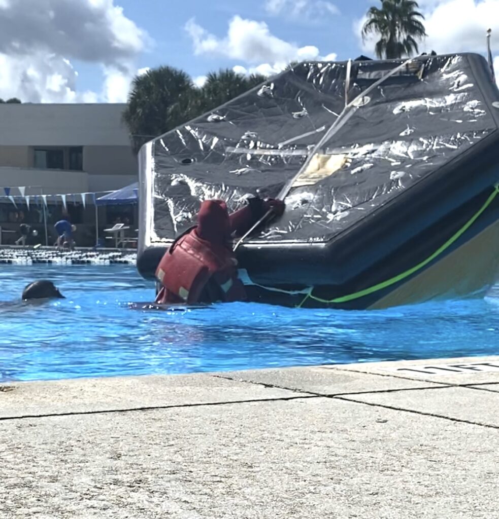 Day 1 was spent in class for Personal Survival Techniques with the main objective being to understand the steps to follow in case of an emergency (where to go, who to contact, what to prioritize, and when to perform certain duties). The course ended on day 2 when we went to the pool for the practical exam. We tread water, practiced wearing PFD’s, wearing immersion suits, and flipping a life raft. The immersion suit was easily my least favorite thing; I felt trapped and joked later how I would probably die from anxiety in that suit before hypothermia! Flipping the life raft was fun and probably the most practical thing I learned that day, and hopefully, I will never have to apply it.