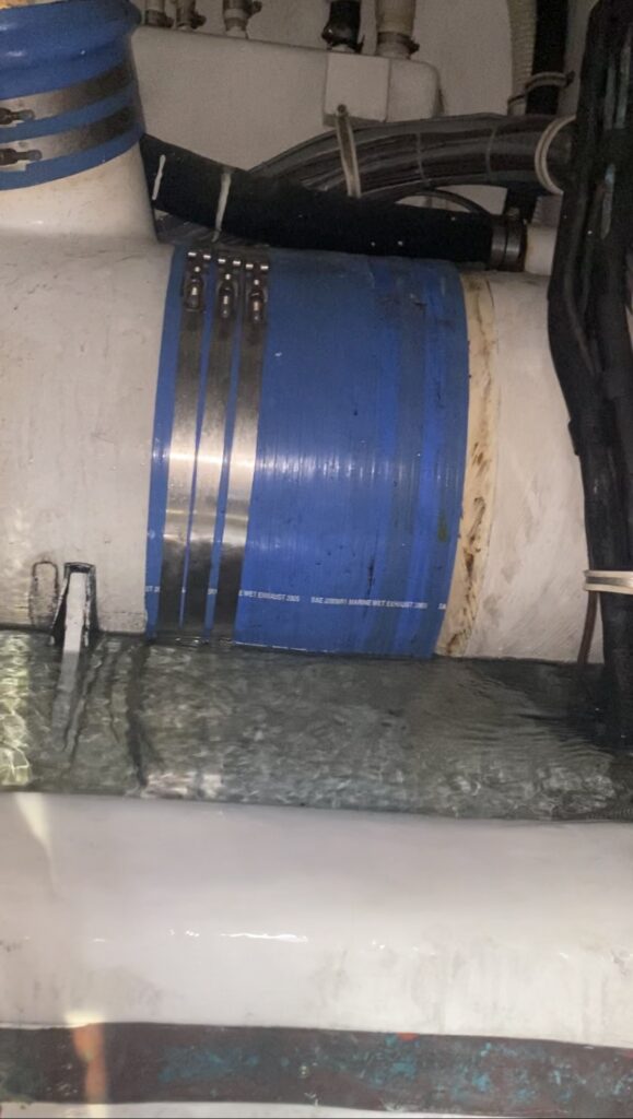 After my grandfather discussed insurance, tow started the bilge pumps. There was barely a decrease in the water level, but it was enough to start looking for where the water was coming from. We discovered three of the six hose clamps on our exhaust pipe had broken off and the pipe had consequently shifted a little bit. The water was coming in from the exhaust opening in the back.