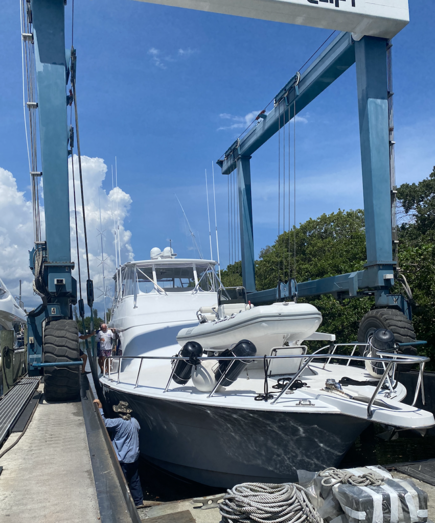 We hauled out, emptied all of our provisions, sprayed the engine room down with fresh water, and made calls and preparations to start on her first thing in the morning. By 4 pm on Monday, the exhaust pipe was fixed with 12 new hose clamps between the port and starboard engines, the electric and wiring had been inspected, generators ran, and we were good to leave the yard and bring her home. We got her home around 7 pm and the only thing we had to replace was the a/c pumps.