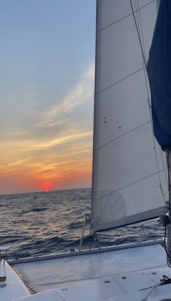 It was a beautiful Leopard Catamaran, with 4 staterooms, 4 heads, and comfortable living areas. Day 1 was gorgeous, there wasn’t much wind so we had to motor, but the ocean was flat and beautiful. An hour after leaving the inlet, we noticed there was something wrong with the port engine, it wasn’t discharging as much water as the starboard, so we turned her off and tried to run mainly on the starboard.